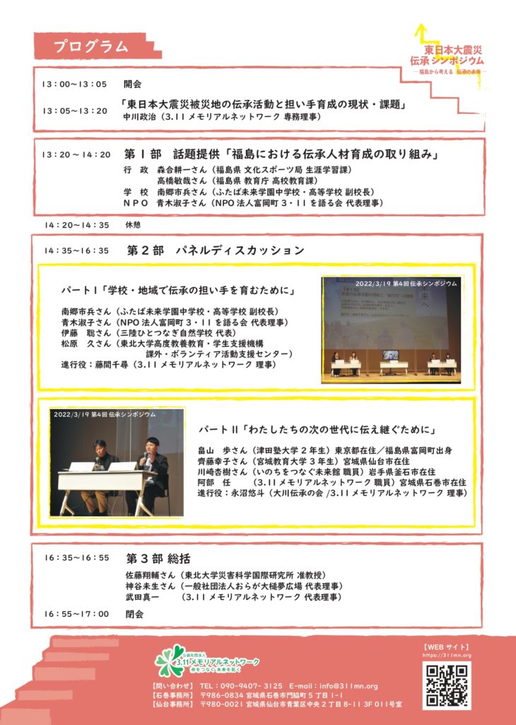 13:00-13:05 開会 13:05-13:20 「東日本大震災被災地の伝承活動と担い手育成の現状・課題」 発表者:中川政治(3.11メモリアルネットワーク 専務理事) 13:20-14:20 第1部 話題提供「福島における伝承人材育成の取り組み」 行政:森合耕一さん(福島県 文化スポーツ局 生涯学習課) 高橋敏哉さん(福島県 教育庁 高校教育課) 学校:南郷市兵さん(ふたば未来学園中学校・高等学校 副校長) NPO:青木淑子さん(NPO法人富岡町3・11を語る会 代表理事) 14:20-14:35 休憩 14:35-16:35 第2部 パネルディスカッション パートⅠ「学校・地域で伝承の担い手を育むために」 南郷市兵さん(ふたば未来学園中学校・高等学校 副校長) 青木淑子さん(NPO法人富岡町3・11を語る会 代表理事) 伊藤聡さん(三陸ひとつなぎ自然学校 代表) 松原久さん(東北大学高度教養教育・学生支援機構 課外・ボランティア活動支援センター) 進行:藤間千尋(3.11メモリアルネットワーク 理事) パートll「わたしたちの次の世代に伝え継ぐために」 畠山歩さん(津田塾大学2年生/福島県富岡町出身) 齊藤幸子さん(宮城教育大学3年生/宮城県仙台市在住) 川崎杏樹さん(いのちをつなぐ未来館 職員/岩手県釜石市出身) 阿部任(3.11メモリアルネットワーク 職員/宮城県石巻市出身) 進行:永沼悠斗(3.11メモリアルネットワーク 理事/宮城県石巻市出身) 16:35-16:55 第3部 総括 佐藤翔輔さん(東北大学災害科学国際研究所 准教授) 神谷未生さん(一般社団法人おらが大槌夢広場 代表理事) 武田真一(3.11メモリアルネットワーク 代表理事) 16:55-17:00 閉会 |