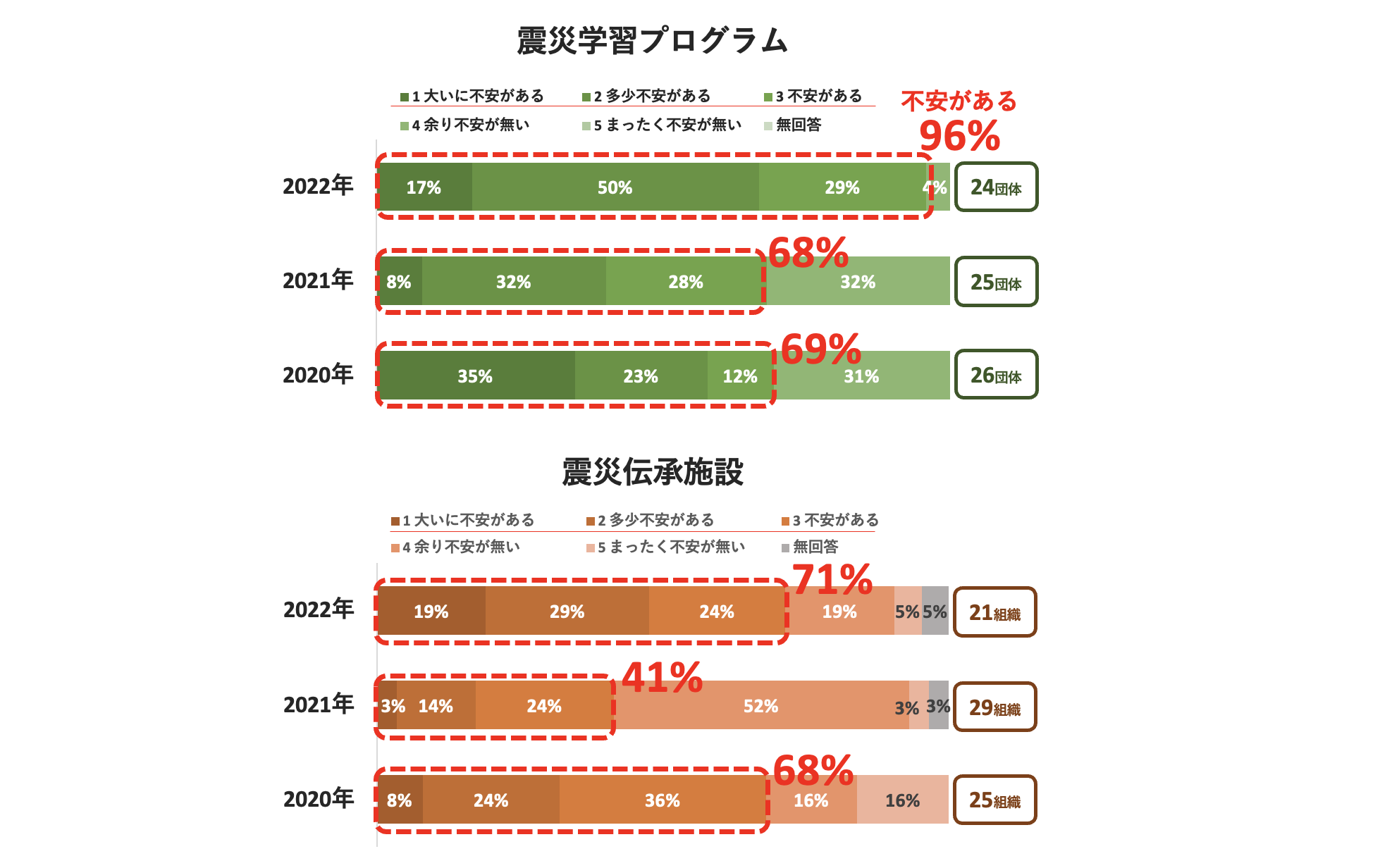 - 活動を継続する上で不安を感じているかどうかについて質問したところ、「不安がある」(=「大いに不安がある」「多少不安がある」「不安がある」の合計)と回答したのは、震災学習プログラムを実施している24団体中23団体(96%)、震災伝承施設を運営している21組織中15組織(71%)だった。