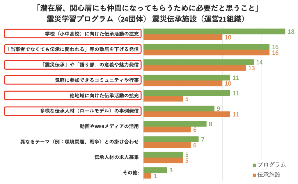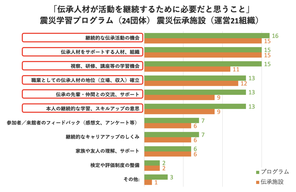 前の質問でも、不安の理由として複数の団体が言及されていた「伝承人材育成」に関連し、震災伝承に取り組む団体・組織が日頃感じている問題意識、また、その解決に向けて必要だと感じていることについて質問をした。