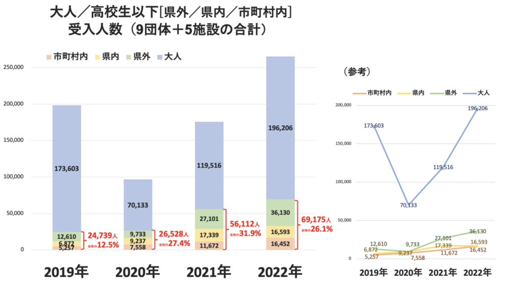 第1弾調査で、コロナ以降、プログラム参加者/施設来館者全体に占める高校生以下の人数割合が増加傾向にあることが分かった。第2弾では、さらに、高校生以下の方の内訳について追加で質問を行った。「県外」「県内」「市町村内」のいずれから訪れているのか、人数を把握されている9団体/5施設の回答に、大人の人数(※)も合わせて整理した。