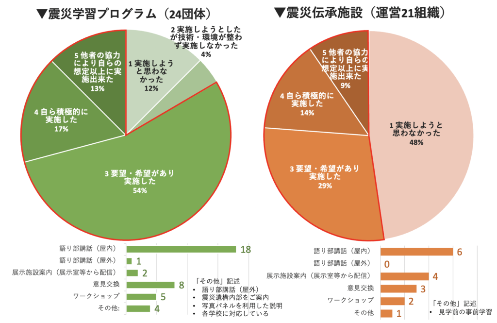 - 2022年調査では、震災学習プログラムを実施している24団体のうち86%、震災伝承施設を運営している21組織のうち52%が、オンライン伝承活動を実施していることがわかった。