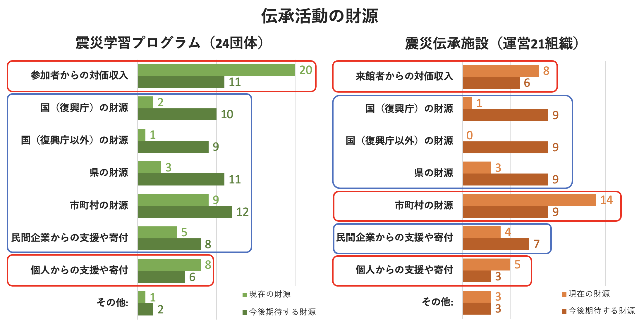 - 《現在は使用している団体・組織は少ないが、今後の期待が大きい財源》としては、「国(復興庁)の財源」「国(復興庁以外)の財源」「県の財源」「民間企業からの支援や寄付」(+震災学習プログラムは「市町村の財源」も)が挙げられる。