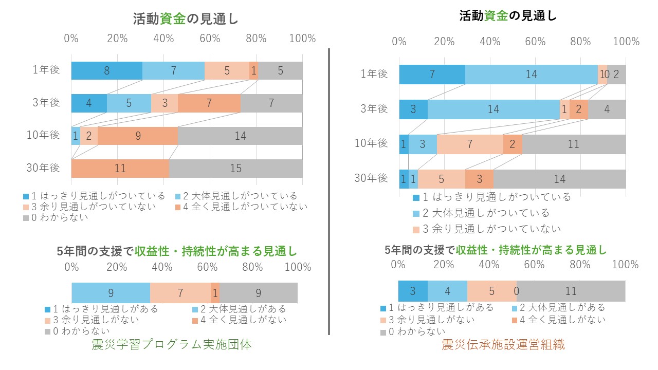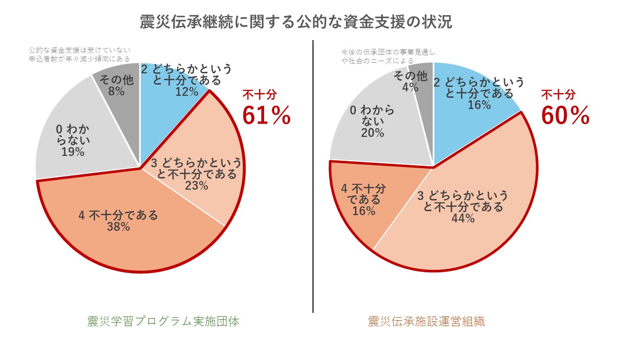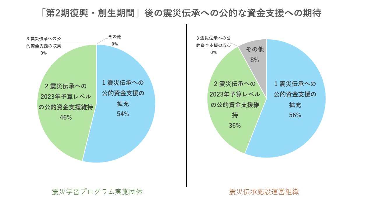 「公的資金支援の拡充」への期待が伝承団体は54%、伝承施設は56%であった。一方、「2023年度レベルの維持」への期待が震災学習プログラム実施団体は46%、震災伝承施設運営組織は36%であった - 両者とも「第2期復興・創生期間」後に「公的資金支援の収束」を期待する回答はゼロであった。