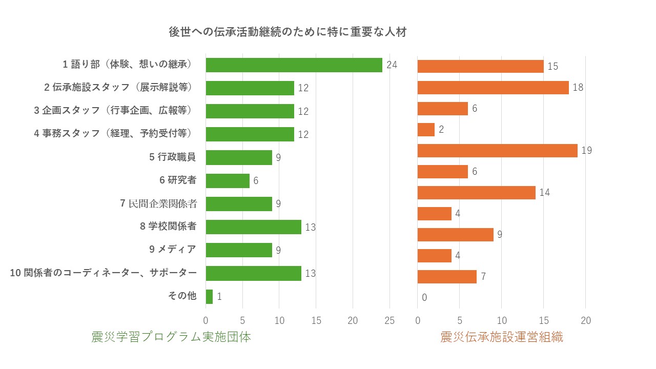 伝承団体は「語り部」が最多、伝承施設は「行政職員」が最多であった。 - 「研究者」、「学校関係者」、「メディア」に対する回答は、伝承団体、震災伝承施設で同傾向であった。