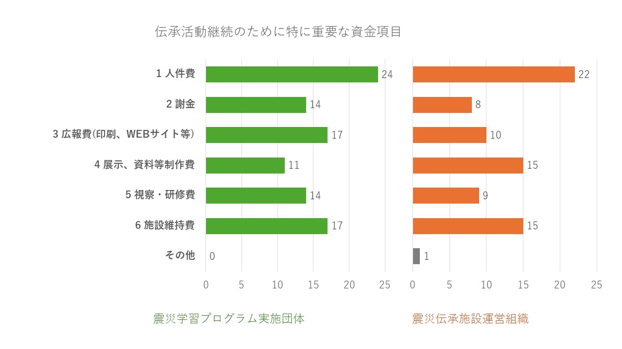 伝承団体、伝承施設ともに、「人件費」に最多の回答があった。他選択肢からの差が大きく、伝承を担う「人」の重要性が示唆された。 - 「人件費」の次に、伝承団体は「広報費」、「施設維持費」を、