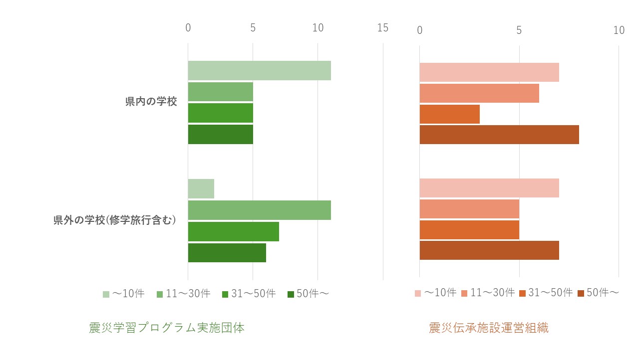 - 伝承団体は県内よりも県外の学校との関わりが多く、伝承施設は県内・県外ともに年間50件以上の多くの学校との関わりが見られた