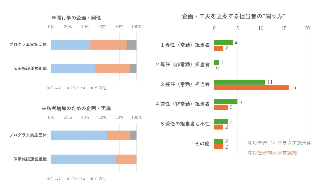 - 年間行事、来訪者増加のための企画のいずれも、伝承団体よりも伝承施設の方が企画・開催していた