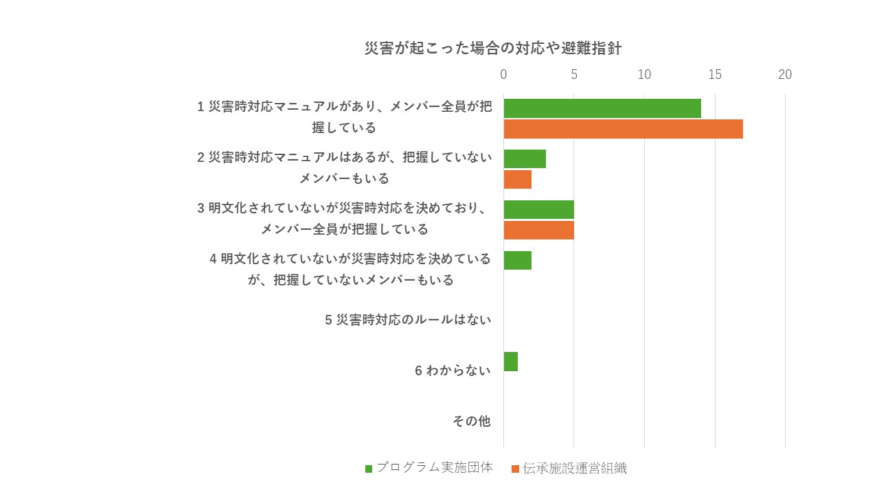 - 伝承団体、伝承施設ともに「災害対応マニュアルがあり、メンバー全員が把握している」が最多であった。