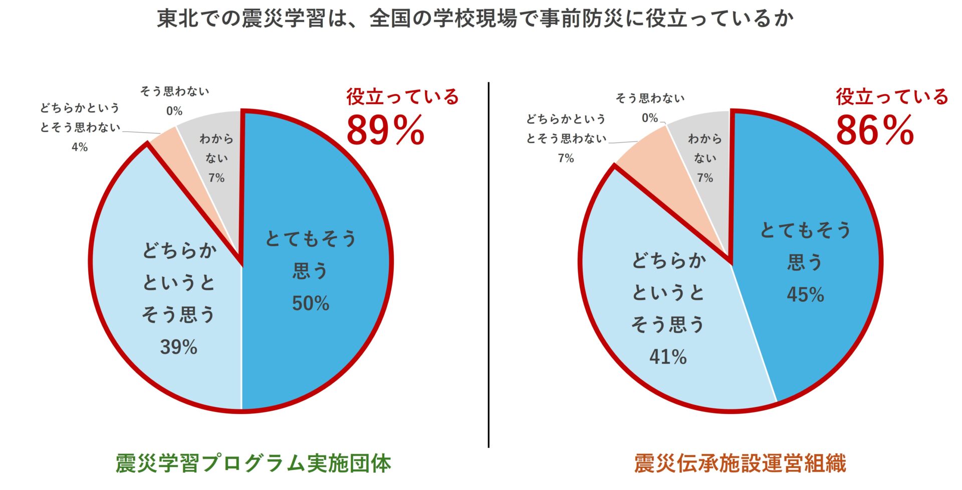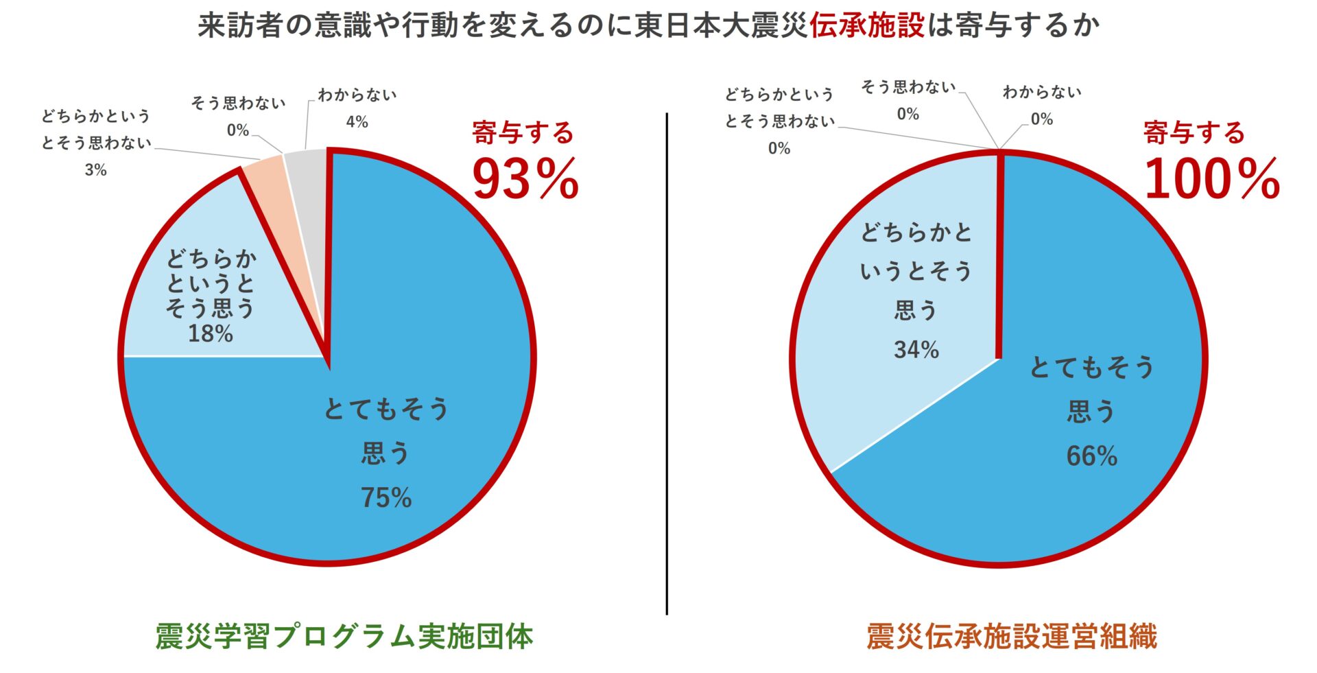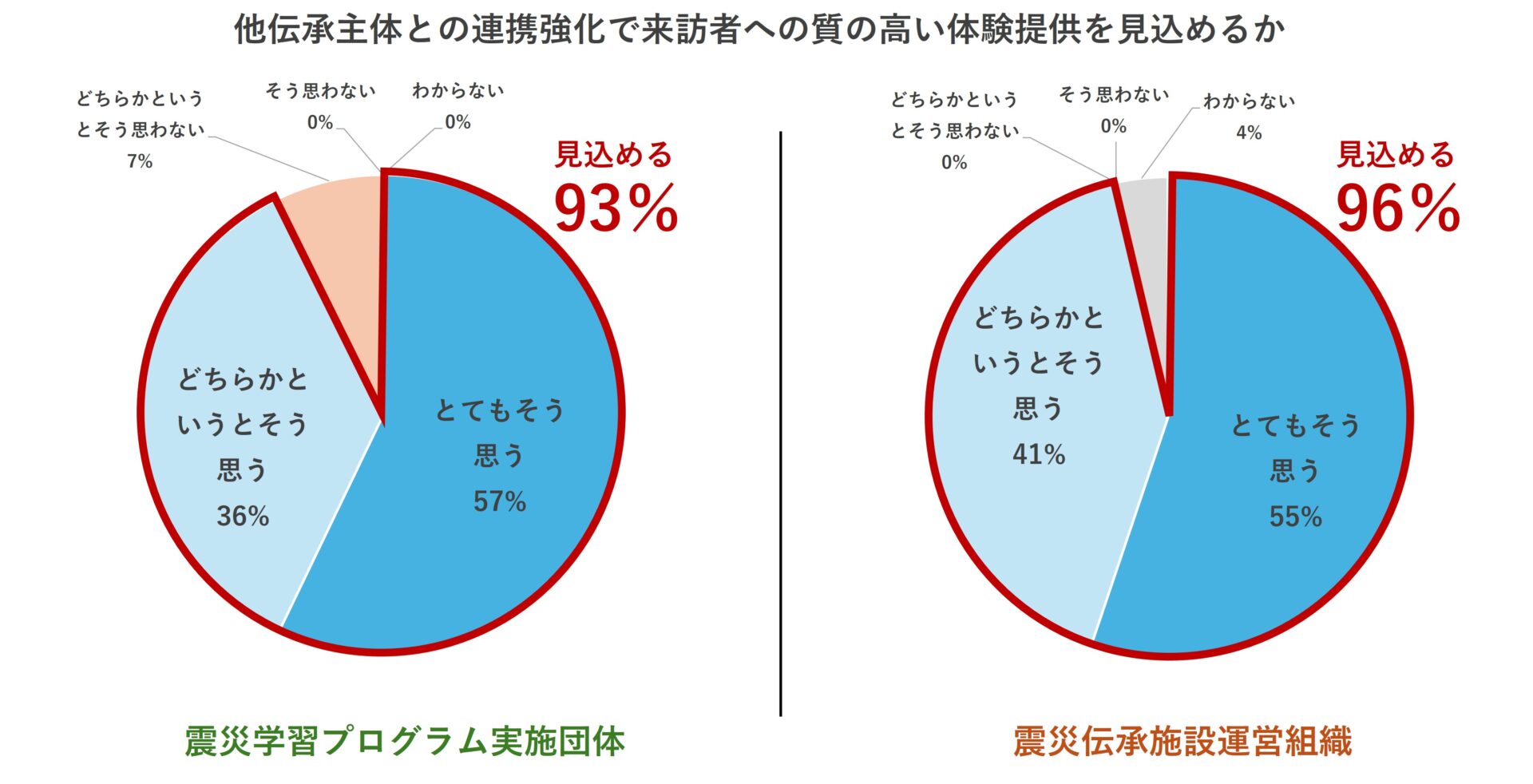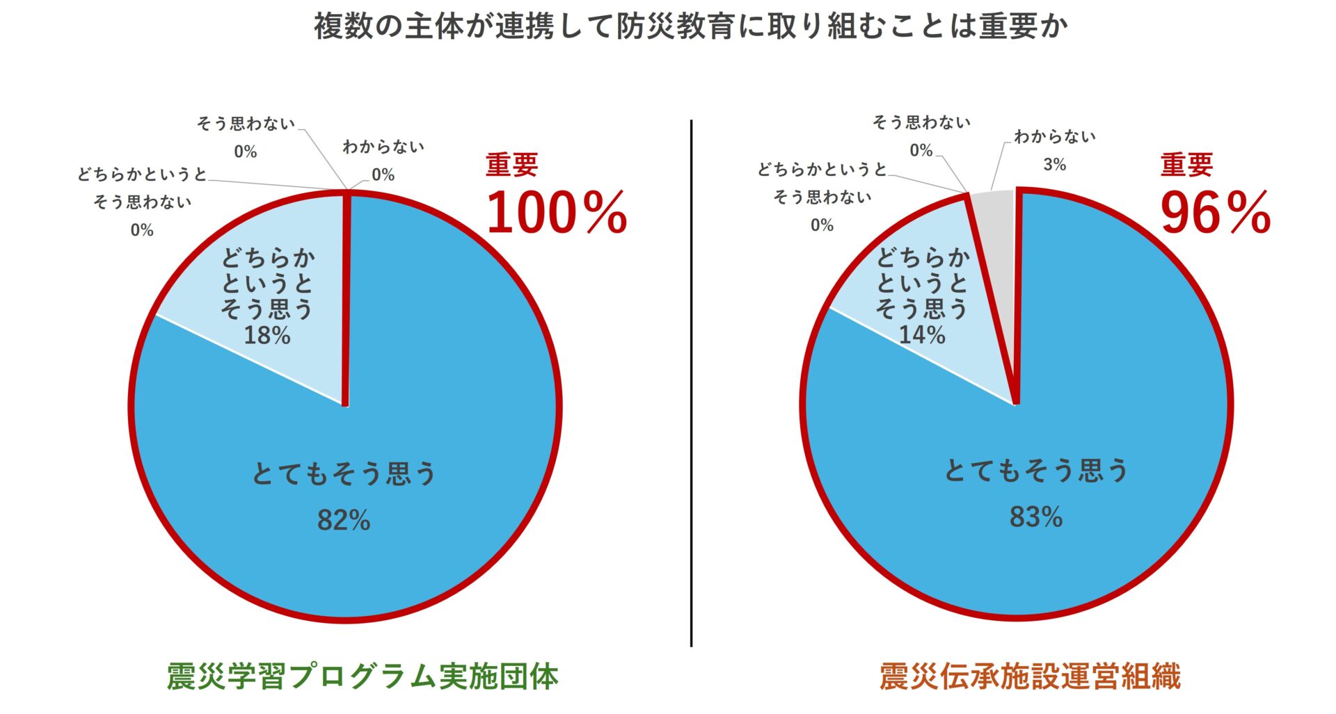 伝承団体は100%、伝承施設は96%から、複数の主体が連携して防災教育に取り組むことの重要性について「とてもそう思う」または「どちらかというとそう思う」との回答が得られた。