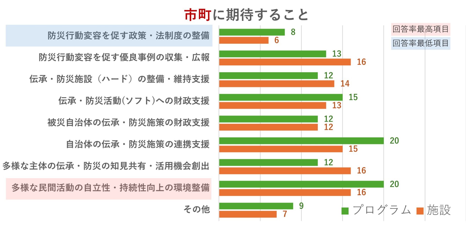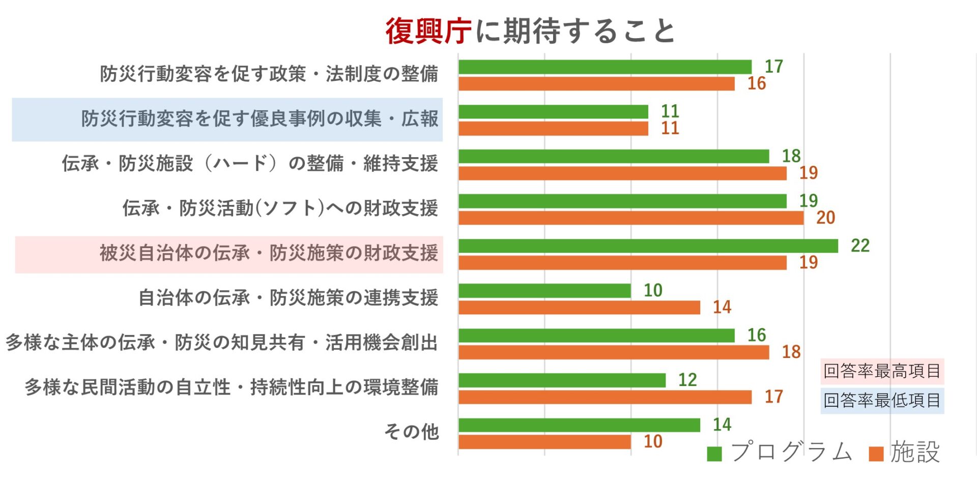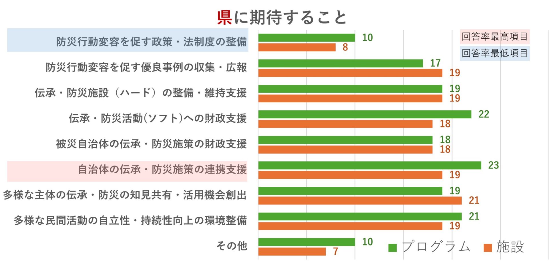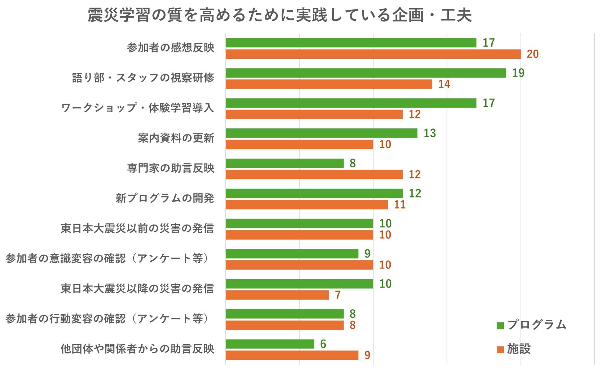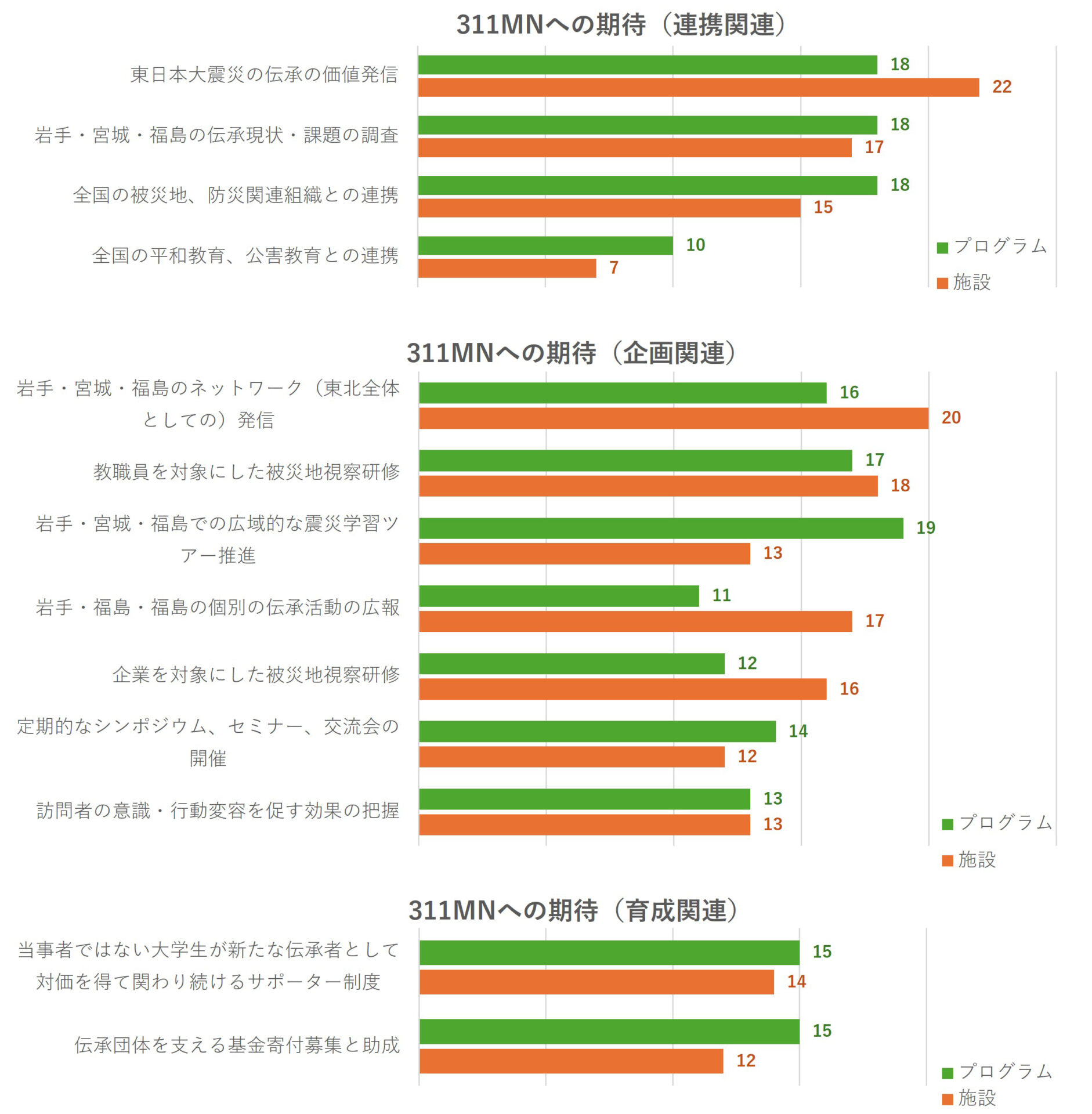 また、伝承団体と伝承施設からの回答で5件以上の差があった項目は「岩手・宮城・福島での広域的な震災学習ツアー推進」(団体19件、施設12件)、「岩手・宮城・福島の個別の伝承活動の広報」(団体11件、施設16件)、「伝承団体を支える基金寄付募集と助成」(団体15件、施設10件)であった。