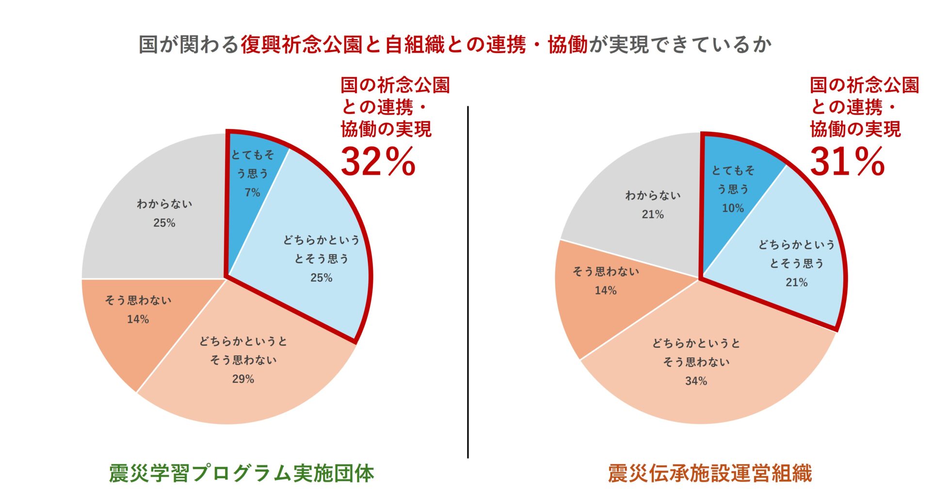 また、岩手・宮城・福島の各県には国営追悼施設を含む復興祈念公園が進んでおり、多様な主体の参画やゲートウェイ機能を掲げられている中、「国が関わる祈念公園との連携・協働の実現」に対しては「とてもそう思う、どちらかというとそう思う」が伝承団体・施設共に3割で、協働や連携に関する課題や期待の声が自由記述欄からも確認されました。