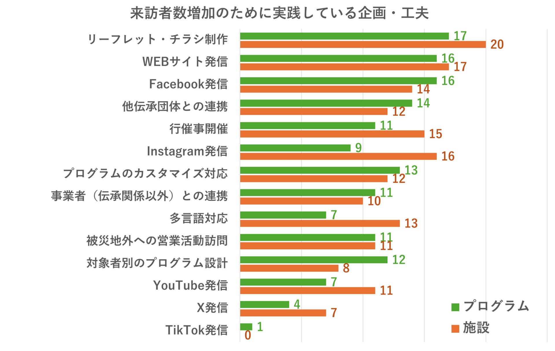 来訪数を増加させる企画・工夫に対して、伝承施設の方が行催事開催、リーフレットやSNS発信に多くの回答が得られた。