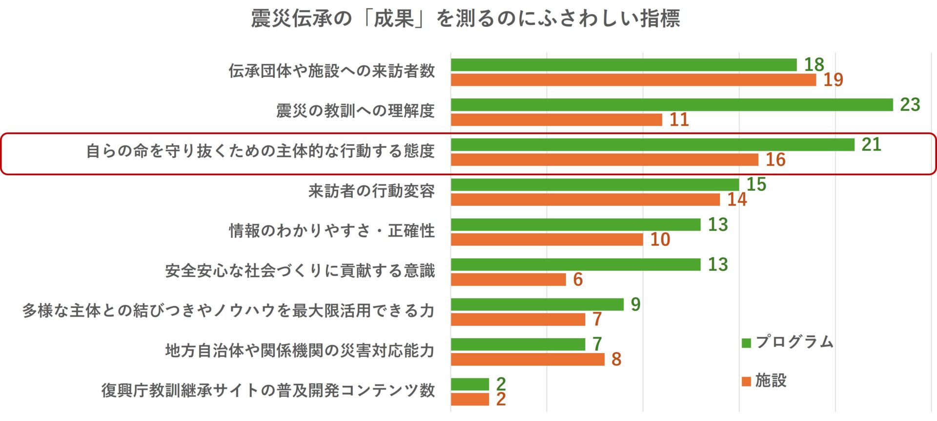 震災伝承の「成果」指標については、合計回答数の最多が「伝承団体や施設への来訪者数」でその次が「自らの命を守り抜くための主体的に行動する態度」、最小が「復興庁教訓継承サイトの普及開発コンテンツ数」であった。