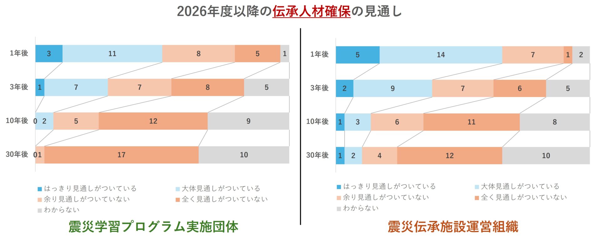 30年後に伝承人材の継続見込みのある伝承団体は0、施設2組織のみ、という厳しい環境ではありますが、成果指標も共有されていない新しい取り組みであるからこそ、震災伝承活動の充実と活性化により次の災害から命が守れる期待が確認された調査でもあると捉えておりあmす。