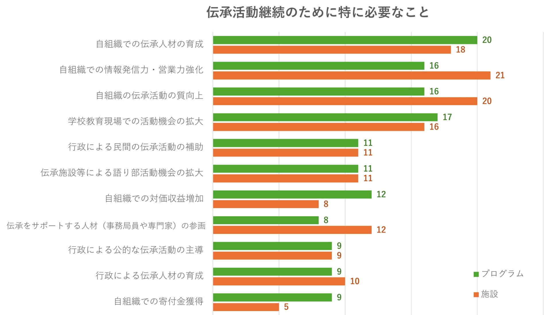 「小中学校からの学習の機会の創出」が最多であった。「選任職業としての安定化」は、伝承団体と伝承施設で回答数に差異が見られた。