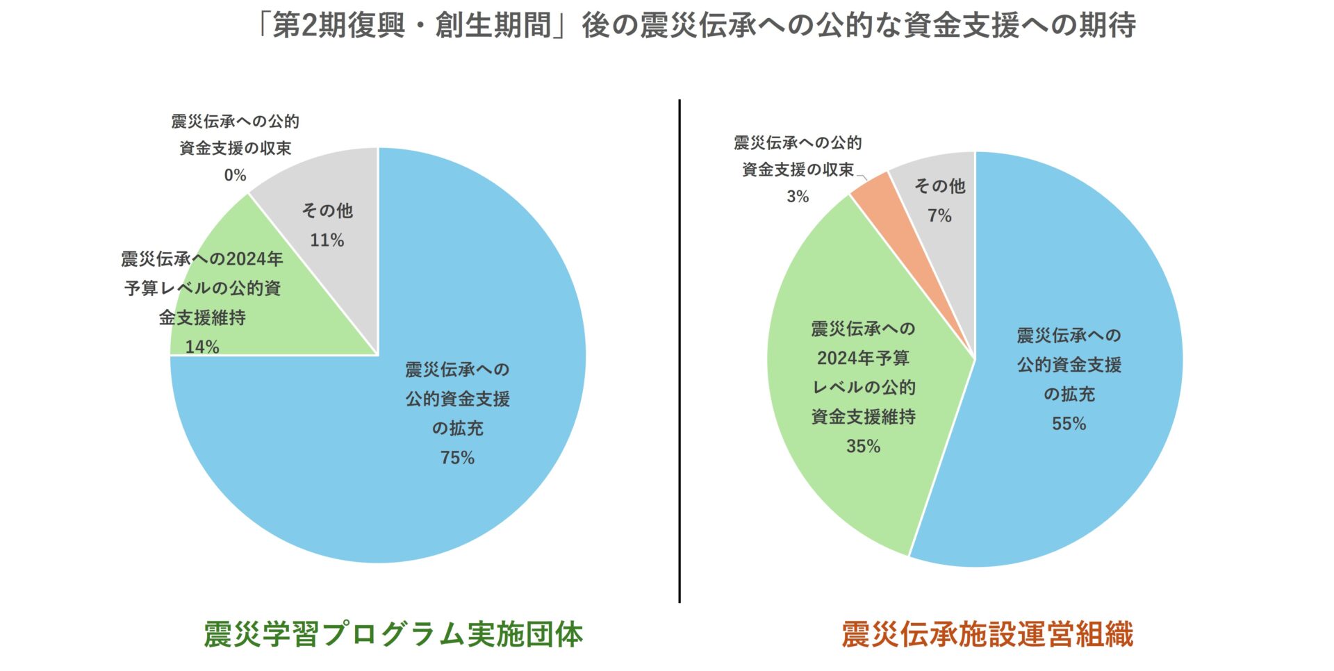 「第2期復興・創生期間後」の公的な資金支援への期待を尋ねたところ、伝承団体の76%、伝承施設の54%が「拡充」への期待を示した。