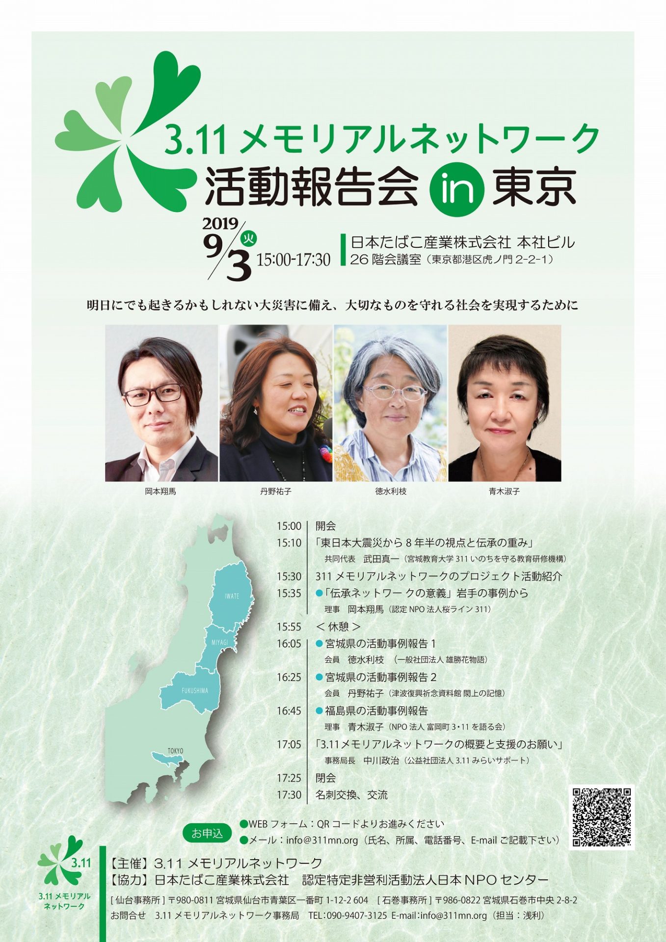 今回の報告会では、3.11被災地の課題、3県の伝承活動事例、また東北全体の伝承ネットワークの役割を、当事者からご報告します。