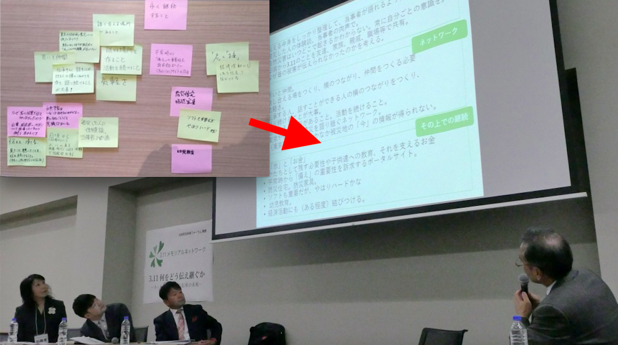 ご来場いただいた方々からも、「全国、世界も含めて、広く永続的に伝え継ぐためには何か必要か」ご意見を出していただき、大別すると以下のような声が寄せられました。
