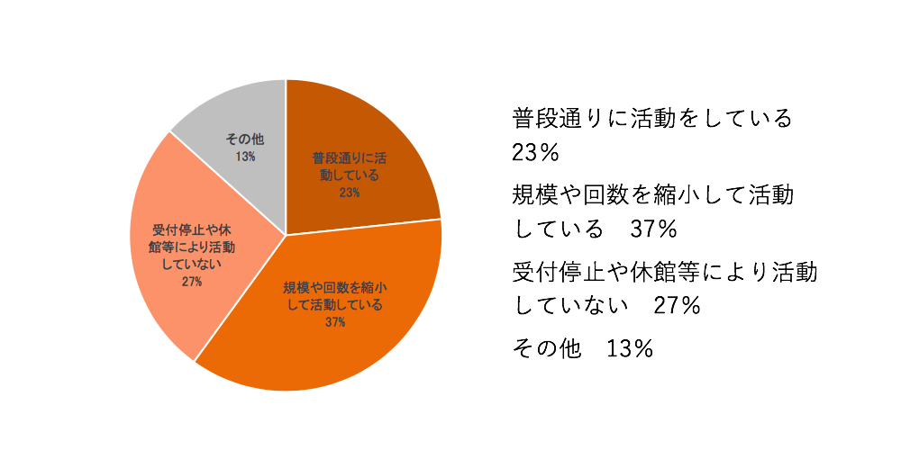 - 新型コロナ感染拡大の収束時期が見通せず、今後どうなるのかわからない中で、行事の企画・開催ができない/キャンセルが相次いでいる/新規申し込みが入らない/調整が進められない。(今後の活動予定が全てなくなったという団体もある。一方で、学校や企業など申し込み側でも、次年度の計画の見通しが立てられずに困っている。)